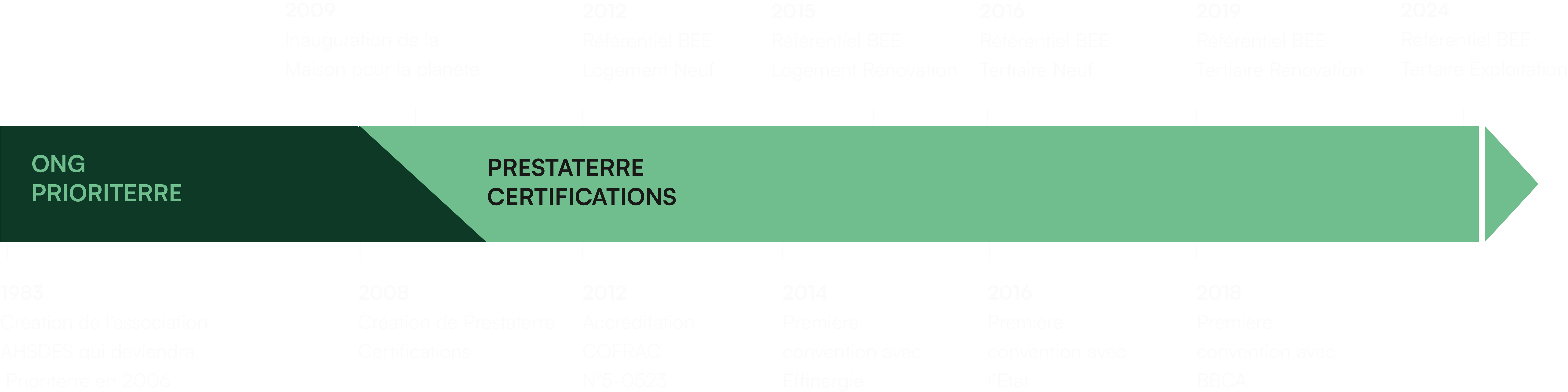 Depuis 2008, Prestaterre Certifications développe ses propres référentiels sous la marque « Bâtiment Energie Environnement » (BEE) associés à ceux de l’Etat (Label « Bâtiment biosourcé » et Label « E+C-») ainsi que ceux de ses partenaires, les associations Effinergie et BBCA.